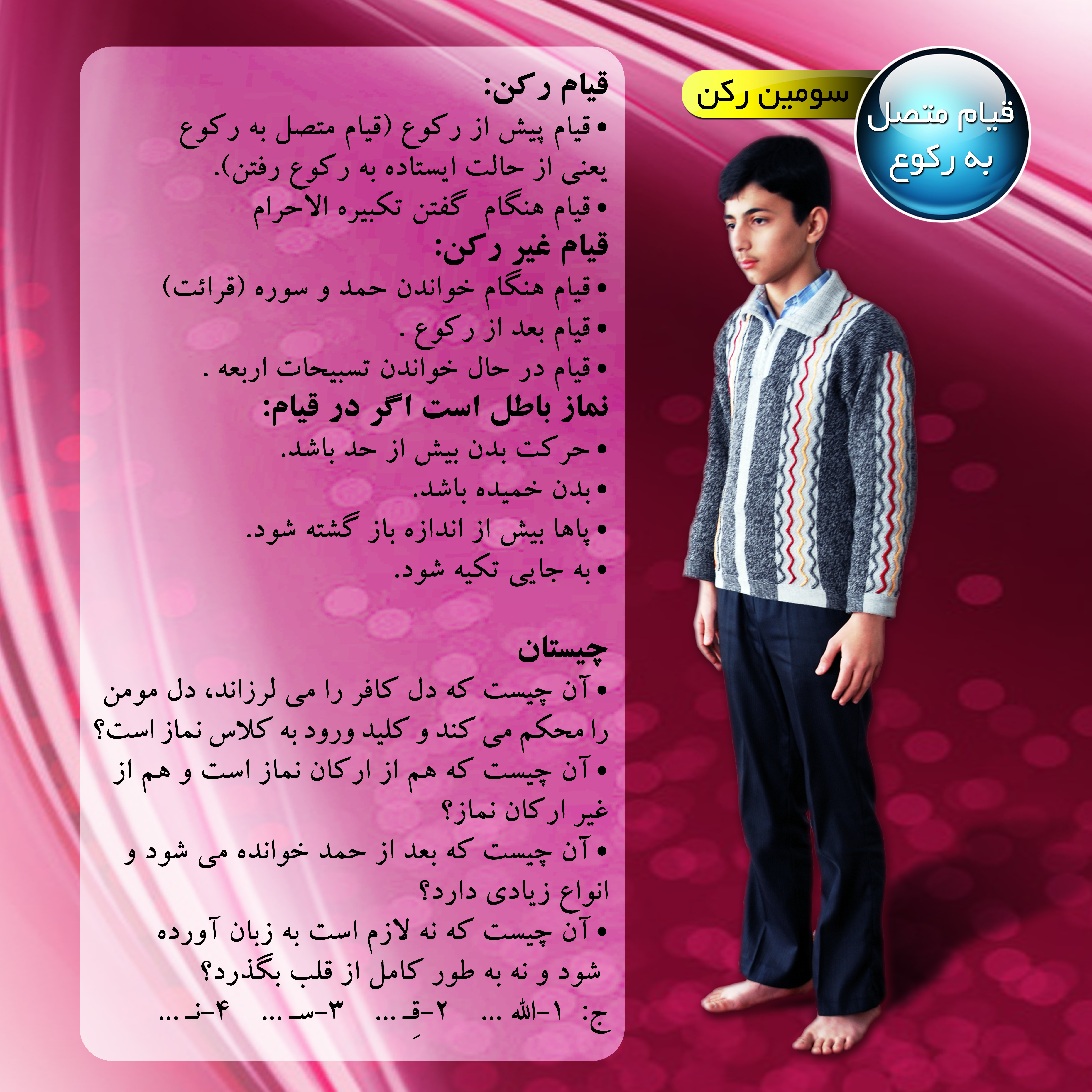 پیامبر گرامی، بنده ی خوب خدا، چه خوب خدای مهربانی را عبادت می کرد. خدای خود را نیایش می کرد، نماز را خیلی دوست داشت. صدایش وقت نماز، دل را نوازش می کرد. وقت نماز قشنگترین لباسش تنش بود. باغچه پیرهنش پر از شکوفه های عطر بود. دست ها را بالا می برد،«الله اکبر» می گفت. توی چشمهایش هزار گل ستاره می شکفت.